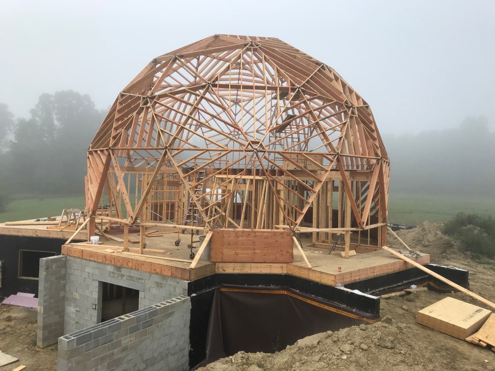 This week the T-blocking and studs on the outer dome were completed. There are open triangles where the windows are going to go and the framing of the first floor within the dome is done. Now we can “walk through” the rooms and our almost-three year old M delights in saying “I am standing in the library! I’m standing in the closet! I am standing in mama and dada’s room!,” etc etc.