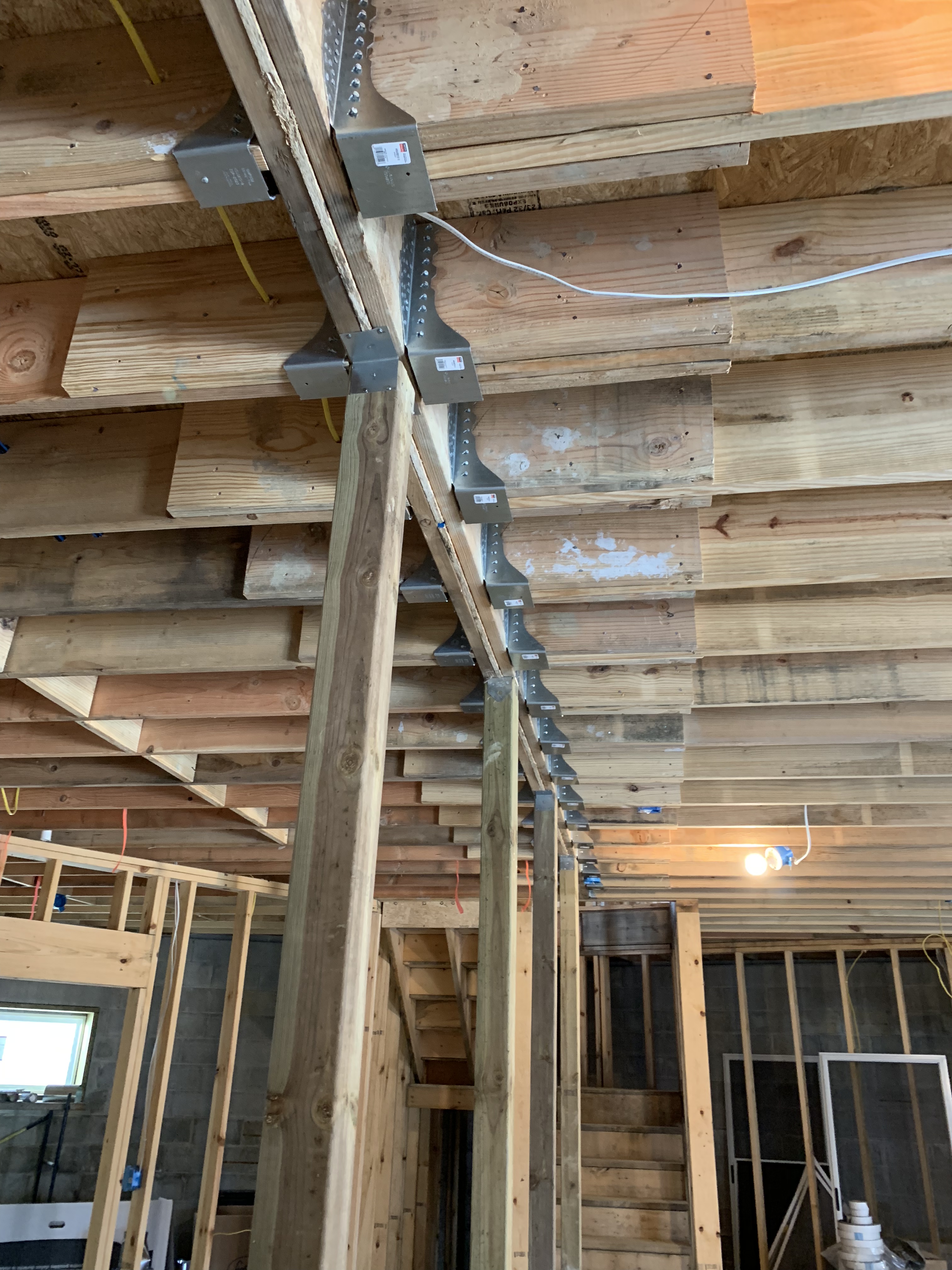 Main beam Repair Posted by brokenbranchfarm on February 18, 2019February 24, 2019 The main beam has two new posts installed for additional bearing, and scabs and triple or double hangers to solve the gap issue on the joists.