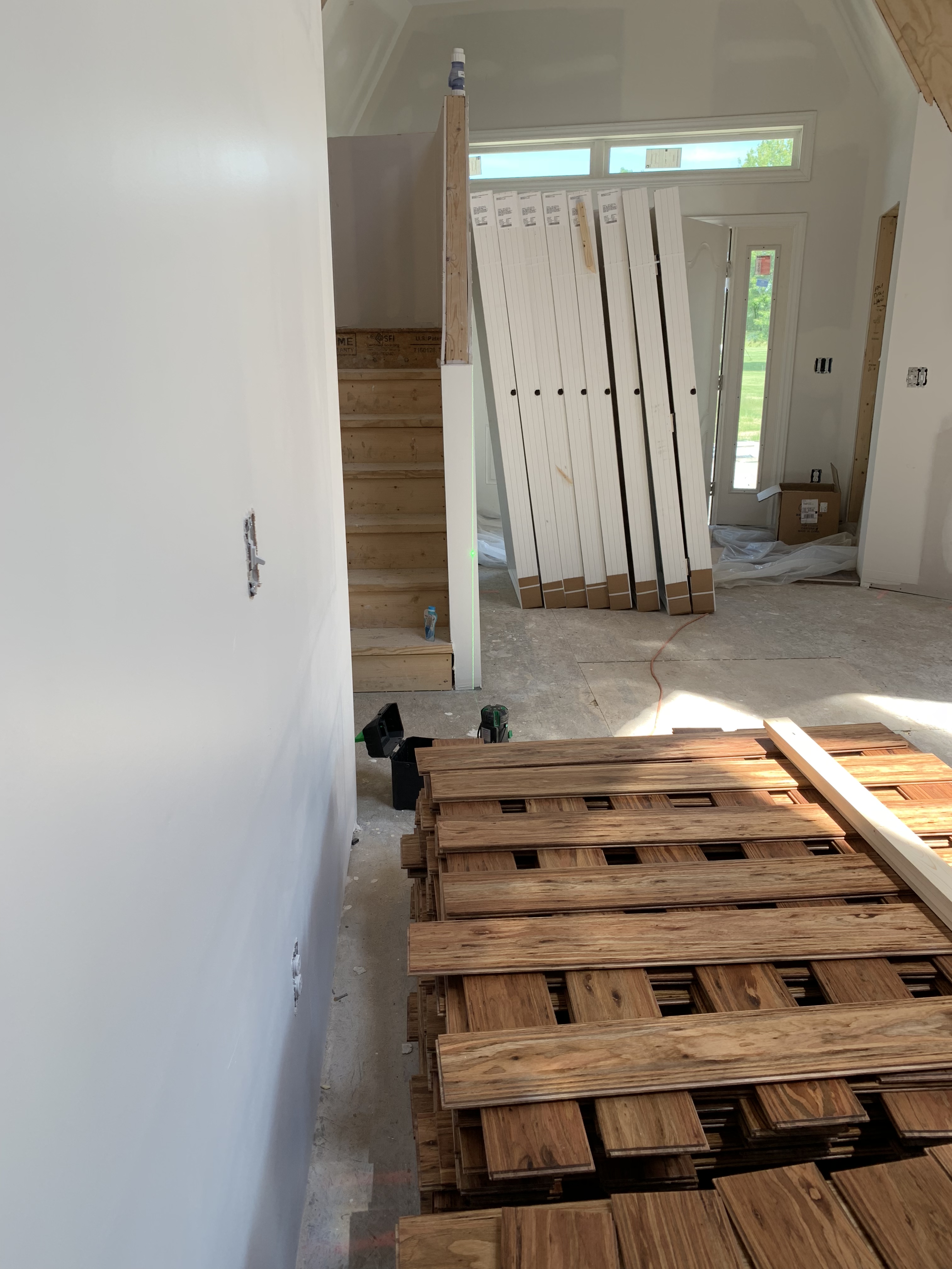 Doors and floors Posted by brokenbranchfarm on June 15, 2019June 16, 2019 Doors and flooring awaiting install, with a freshly primed wall at the left.