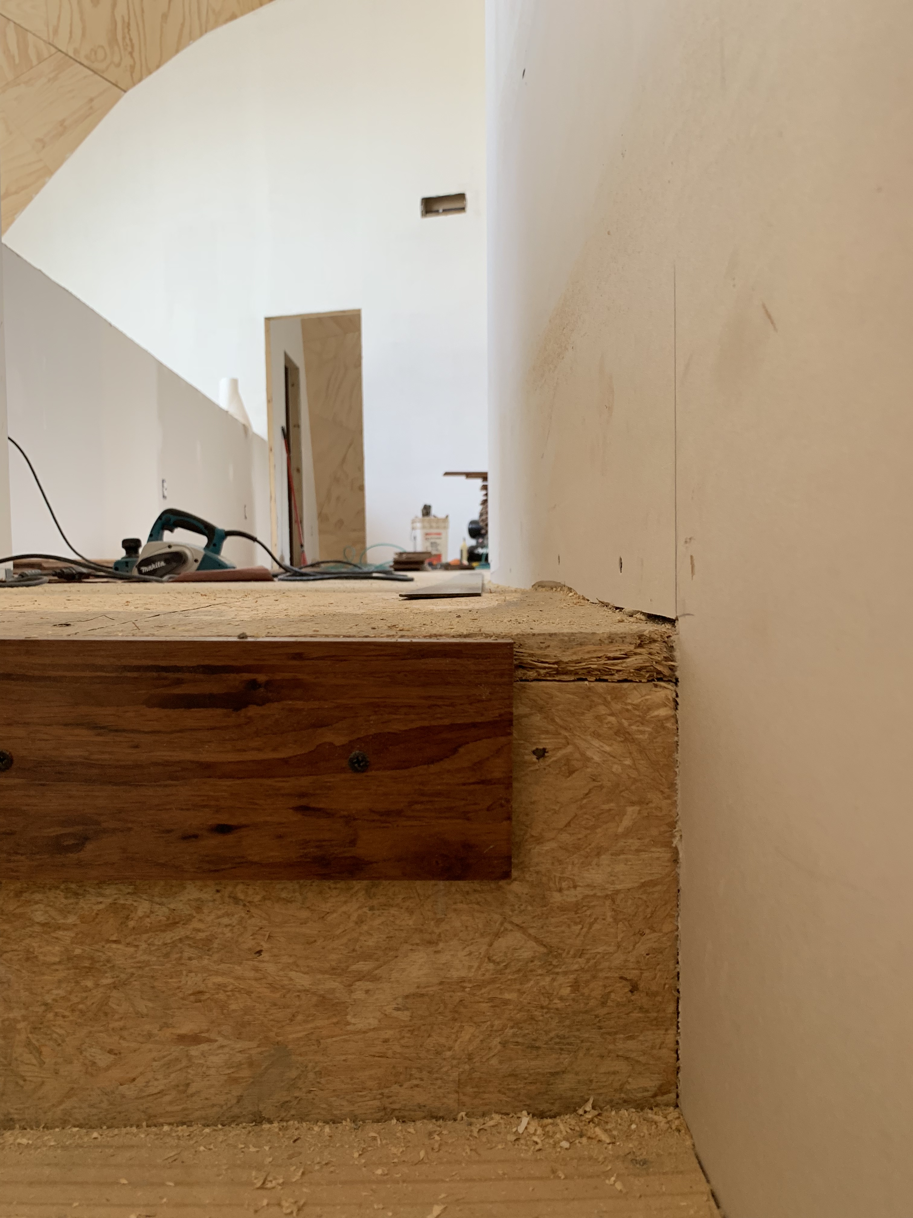 Leveling out the subfloor Posted by brokenbranchfarm on June 28, 2019June 30, 2019 At the top of the stairs the subfloor had a big bump in it that had to be planed down and chiseled so the flooring could lay flat.