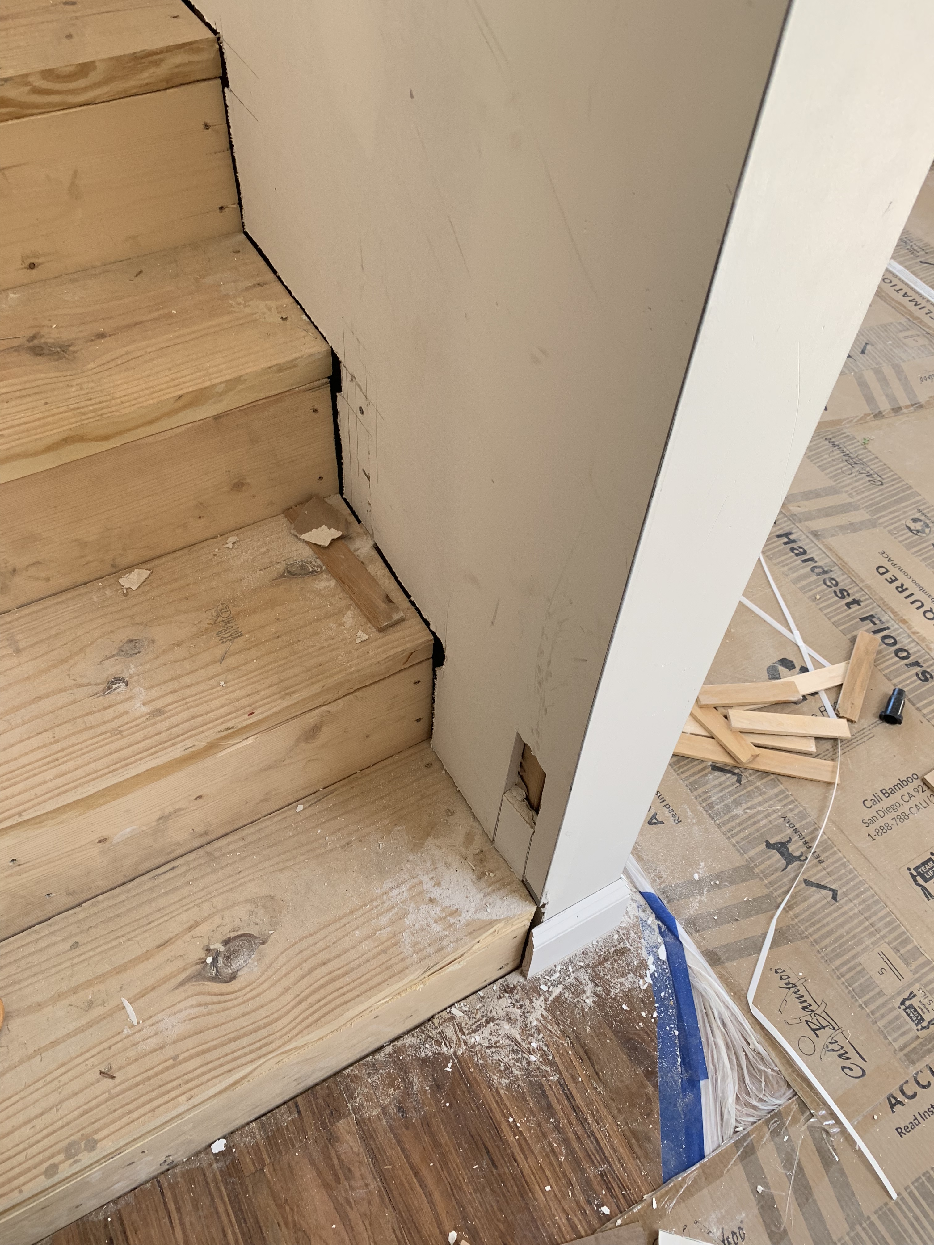 Fixing the crooked wall Posted by brokenbranchfarm on June 28, 2019June 30, 2019 This wall was over an inch out of line at the top. Our finish carpenter Chris figured out how to get it to straight with a couple of small cuts in the drywall and some shims.