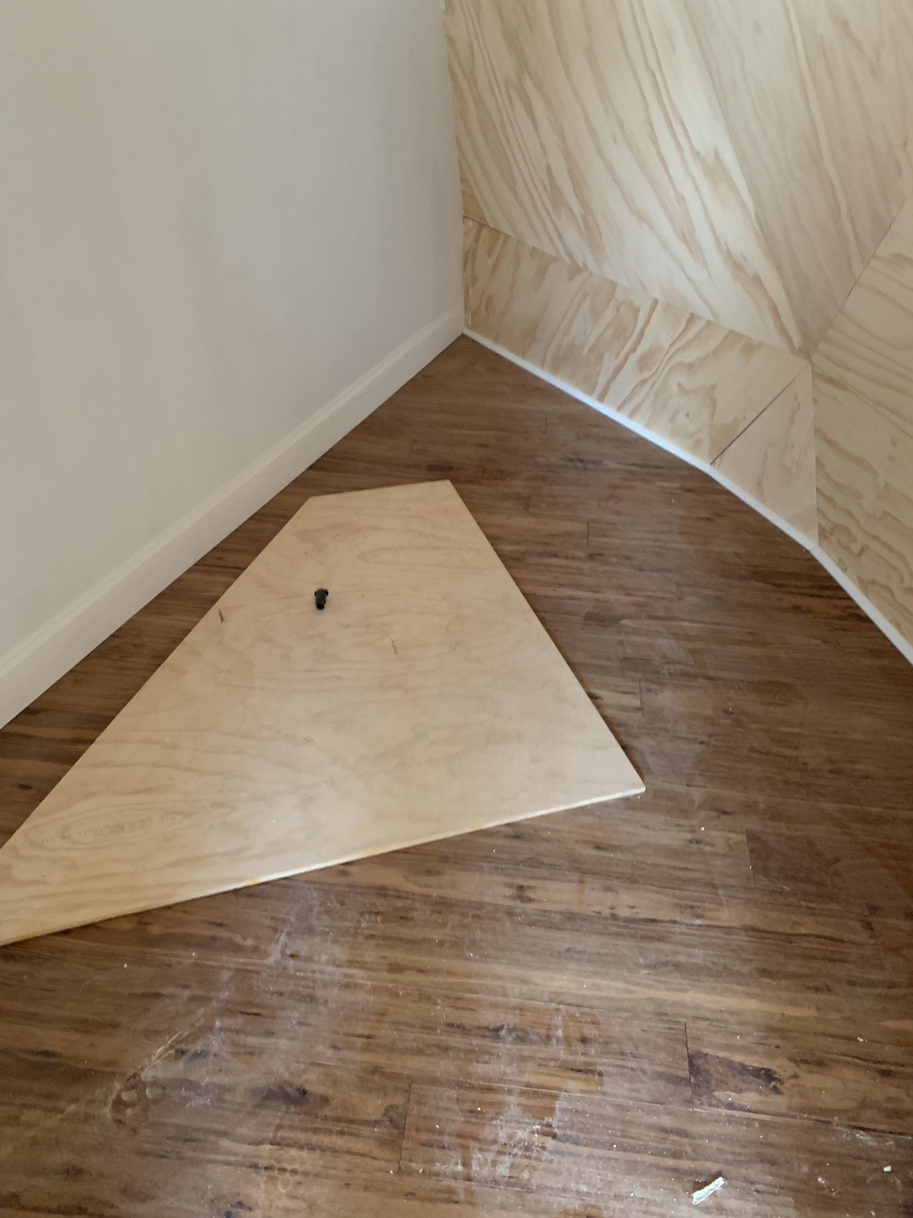 Closet with floor and trim complete Posted by brokenbranchfarm on June 28, 2019June 30, 2019 This is an extra storage space off the guest bedroom upstairs. The base moulding ended up not working along the plywood wall of the dome interior, so we have shoe moulding in those areas.